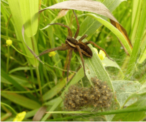 Dolomède des marais – Dolomedes fimbriatus. Femelle avec ses jeunes. © E. IORIO/GRETIA.