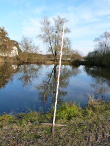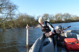 Cette campagne de suivi repose sur la mesure de la hauteur de la colonne d’eau de 2 473 points GPS. Il s’agit d’effectuer environ 60 sorties par vent quasi nul (inférieur à 20 km/h). La mesure est effectuée à l’aide d’une perche graduée dotée à sa base d’un croisillon permettant à l’opérateur de « sentir » l’interface eau/vase et de ne pas enfoncer la perche dans les sédiments meubles. La fabrication, en interne, de cette perche en bois de faible densité lui confère une légèreté dans l’eau qui conforte l’effet croisillon et limite ainsi le « percement du toit des sédiments » pour des mesures plus précises.