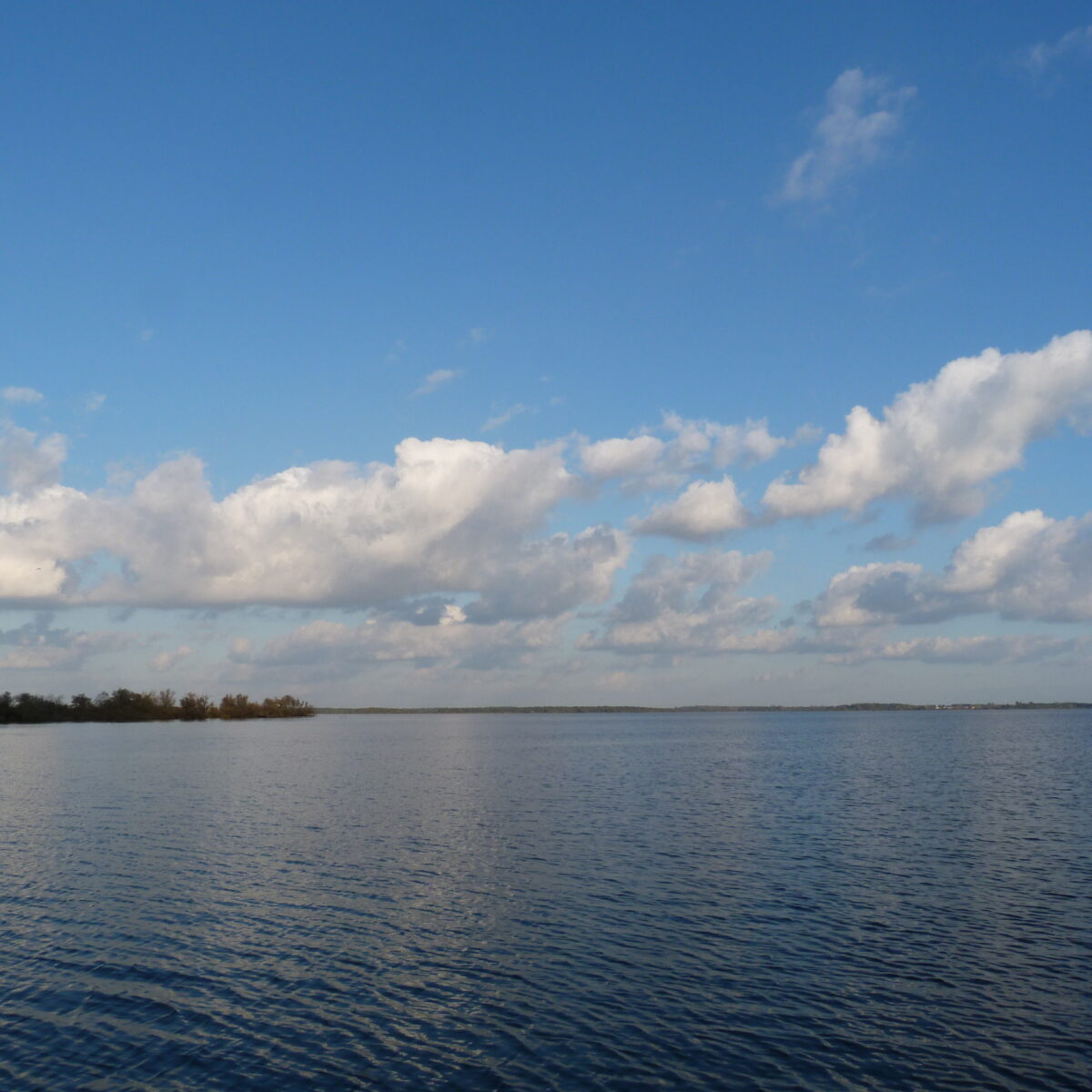 Le centre du lac appelé localement le « large » forme un plan d’eau de 800 hectares très peu végétalisé. Cette zone tend à s’agrandir depuis quelques années du fait notamment de la régression des herbiers de nénuphars.