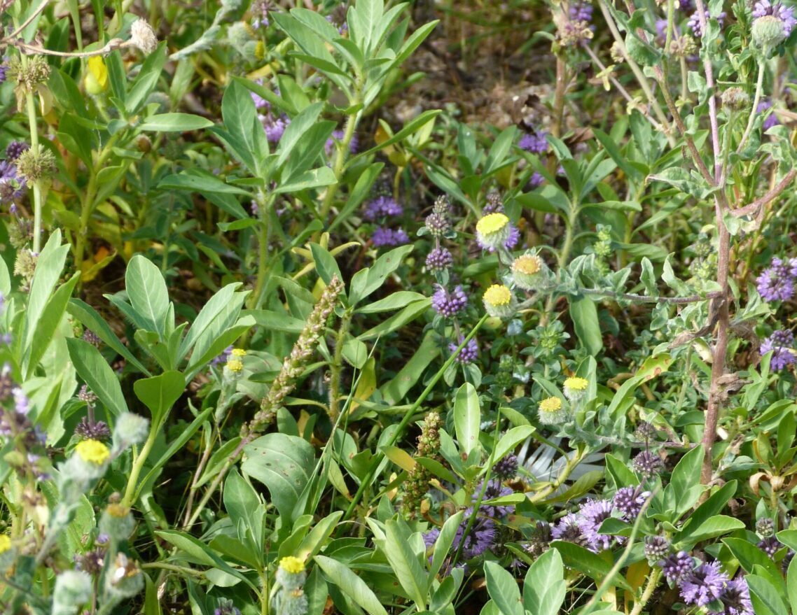 Station à Pulicaire commune - Pulicaria vulgaris - protégée en France, Menthe pouliot - Mentha pulegium - et Jussie à grandes feuilles - Ludwigia grandiflora -invasive.