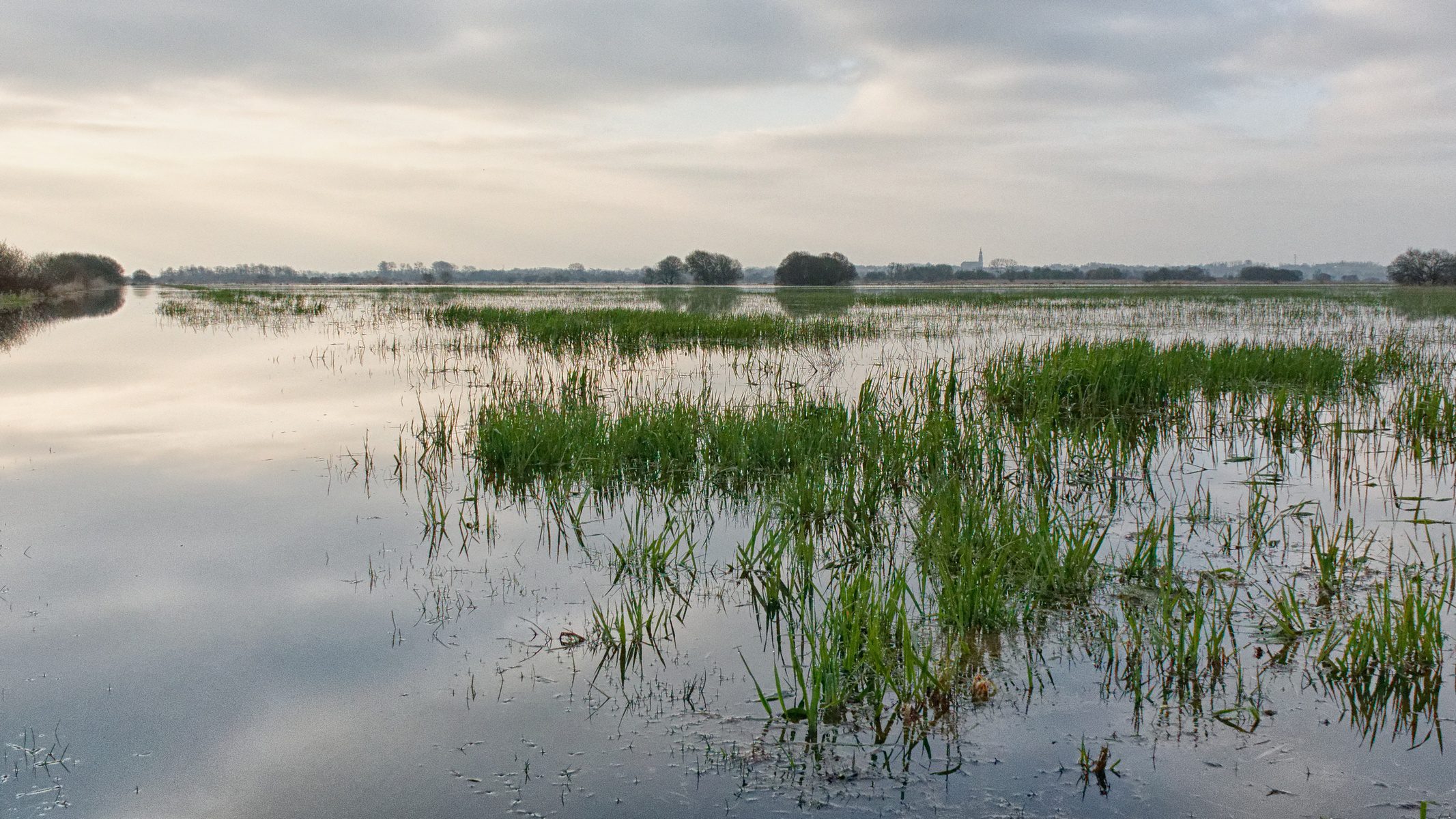 Ces habitats inondables étendues sur 1 500 ha situés en périphérie du lac sont des terres gorgées d’eau. Soumis à des variations des niveaux d’eau, ils peuvent accueillir une flore diversifiée. Autrefois zones de marais, ils ont au fil du temps été drainés (creusement de douves et recalibrage du cours de l’Acheneau) afin d’être plus facilement exploitables.