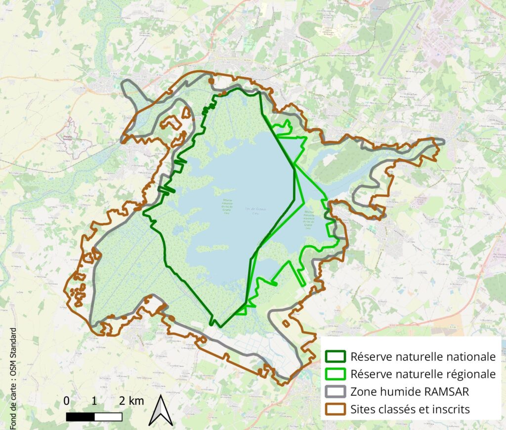 Surface : 17 545 ha répartis sur 6 communes riveraines du lac (Bouaye, Saint-Aignan-Grand-Lieu, La Chevrolière, Saint-Philbert-de-Grand-Lieu, Saint-Lumine-de-Coutais et Saint-Mars-de-Coutais)